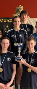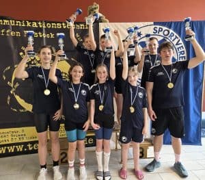Mit einem Jahr Verspätung fand am vergangenen Sonnabend mit überwältigender Teilnahme der 33. Sprintpokal statt. Über 215 Aktive aus 11 Mannschaften kämpften in einem Mehrkampf, bestehend aus je 25 m aller 4 Schwimmdisziplinen, um die Pokale der Firma „Rostock Kommunikationstechnik“. Neben den 89 % persönlicher Bestzeiten stehen vor allem 9 Einzelpokalsiege, 7 Silber– und 3 Bronzemedaillen für unsere Schwimmer in der Wettkampfstatistik. Jeweils 2 Pokalsiege erkämpften sich die Mannschaften von den Dresdner Delphinen, Automation Leipzig, SV Schneeberg und dem FC Erzgebirge Aue. Auch bei allen 4 Staffelwettbewerben standen unsere Teams auf dem obersten Siegertreppchen. Als Startschwimmerin der 4 x 50 m Lagenstaffel schwamm mit 0:31,11 min. Amilia Maneck einen neuen Kreisrekord des Landkreises Leipzig über 50 m Rücken. Im Sprintmehrkampf stellte sie über 25 m Rücken (0:14,93) ebenfalls neuen Kreisrekord auf und verbesserte den 12 Jahre alten Veranstaltungsrekord um 2/100 sek. . Samuel Maneck schwamm über 25 m Delphin in 0:11,94 min. ebenfalls einen neuen Kreisrekord. Weitere Jahrgangsrekorde erkämpften sich Amilia (Jg. 09) über 25 Delphin (0:13,72) und 25 m Kraul (0:13,30) sowie Zoe Kobsik (Jg. 12) über jeweils 25 m Delphin (0:14,19), 25 m Rücken (0:15,64), 25 m Freistil (0:13,78). Linn Heinitz (Jg. 15) verbesserte den bereits 38 Jahre alten Jg.-Rekord über 25 m Brust auf 0:19,32 min.